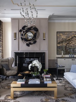 This penthouse with magnificent views of Moscow and a huge terrace is called “Shanghai”. The name suits it perfectly according to its mood — the interior by the architects “Bakharev and Partners” has an original mix of ethnic and colonial motifs in the basis of modern objects and laconic finishes with Art Deco elements. In the living room, all these features are shown most vividly: there is a real wood-burning fireplace with a marble portal, and a complex Japanese-style panel under lacquer, and a chest of drawers with jewelry made of lapis lazuli and selenite, behind patinated mirrors hides a window to the kitchen. In the center of the composition is the author’s carpet designed by Maria Bakhareva and custom-made by Manufacture de Tapis de Bourgogne in collaboration with FIFTH AVENUE.